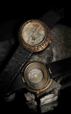 Das versteinerte Fossilmonster kommt aus den Vereinigten Staaten und das Armband dieser seltsamen , in Arta, in Vésenaz bei Genf, signierten Uhr ist offenbar in Krötenhaut ...